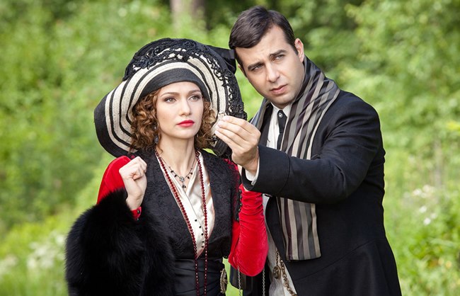 Характер и стиль жизни главных героев определили их образы. Борис Ивана Урганта, как человек светский, носит высокие брюки на подтяжках – ремней тогда еще не было – и характерную для того времени лаковую обувь. Довершает его образ цилиндр и трость, найденная в одной частной коллекции. Не менее актуально для того времени выглядит и героиня Евгении Брик. «Белла – женщина красивая и яркая, к тому же с весьма своеобразным характером, – поясняет Наталья. – Мы подчеркнули его, включив в дорожный костюм героини красное бархатное платье. Тем самым, мы обозначили неординарность Беллы и усилили ее контраст с остальными героями. Она одета по тогдашней моде, а все обитатели дома – стилистически немного старомодные. В том числе, герой Сергея Светлакова, который носит облегченный льняной костюм и канотье».